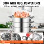 Este vaporizador multifuncional de acero inoxidable viene con cinco niveles de vaporizadores, con un diámetro de 28 cm. Con una capacidad total de 30,6 Qt, cada capa puede proporcionar una gran capacidad de 5,2 Qt, y la olla inferior puede contener hasta 7,5 Qt de capacidad. Cocer al vapor y guisar se puede lograr simultáneamente.