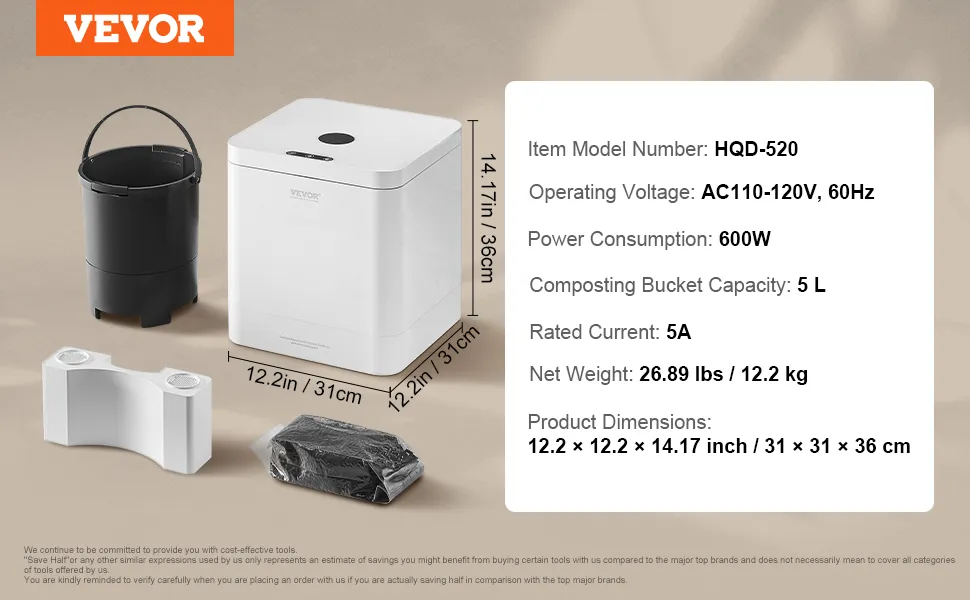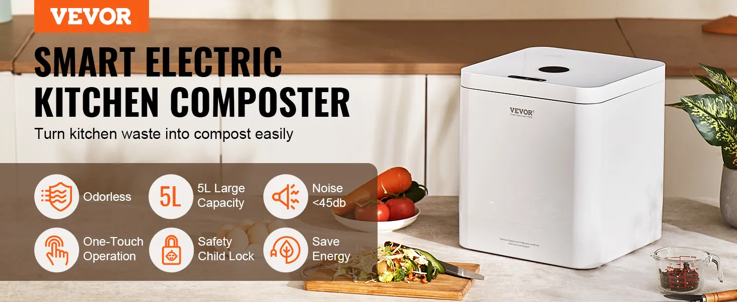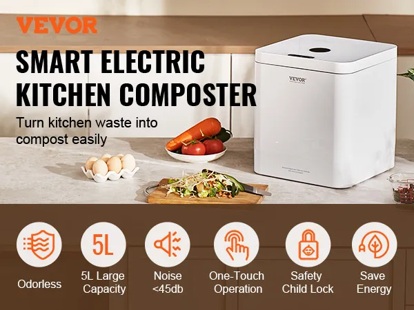 Compostador de cocina VEVOR, compostador eléctrico de 5 L para cocina, compostador inteligente de encimera para interiores, reciclador de alimentos de cocina con 2 modos, convierte los residuos de alimentos en fertilizante natural con un solo botón.