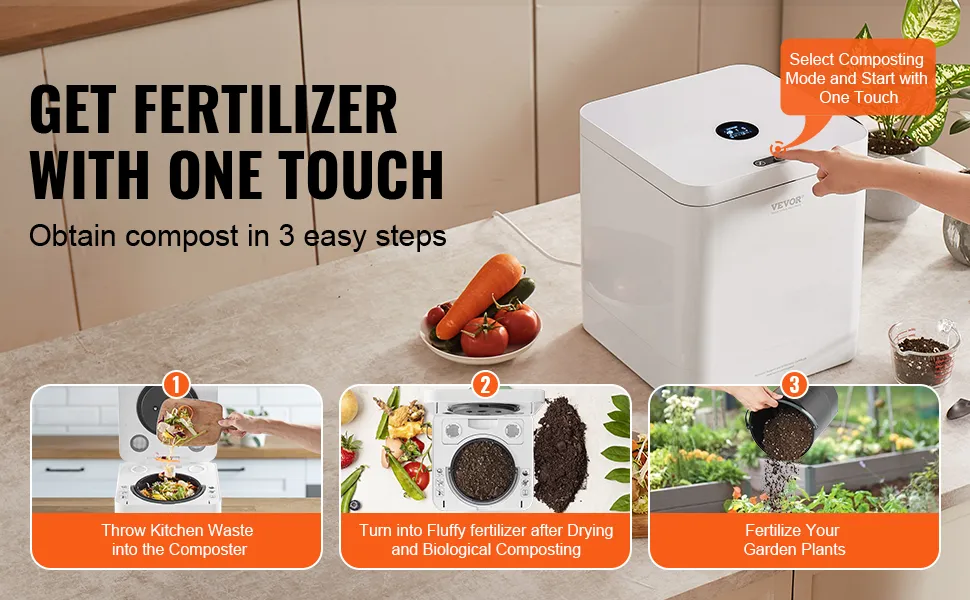 El compostador eléctrico ajusta automáticamente la temperatura y la humedad para garantizar condiciones óptimas de compostaje. Ya sea en modo de secado o en modo orgánico, reduce eficazmente el volumen de desechos, evitando el secado excesivo. Convierte rápidamente los restos de comida en valioso fertilizante orgánico.