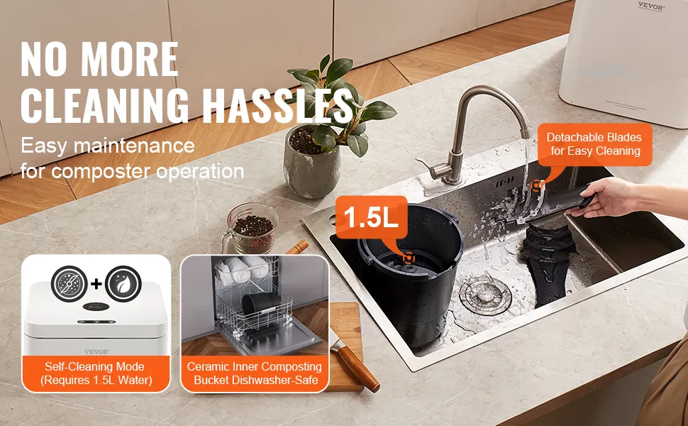 Función de autolimpieza: simplemente agregue 1,5 l de agua para activar la función de autolimpieza, manteniendo el compostador de residuos de alimentos limpio y funcionando de manera eficiente. La cuchilla desmontable permite una limpieza fácil y el contenedor de compostaje de cerámica es apto para lavavajillas, lo que reduce los esfuerzos de mantenimiento.