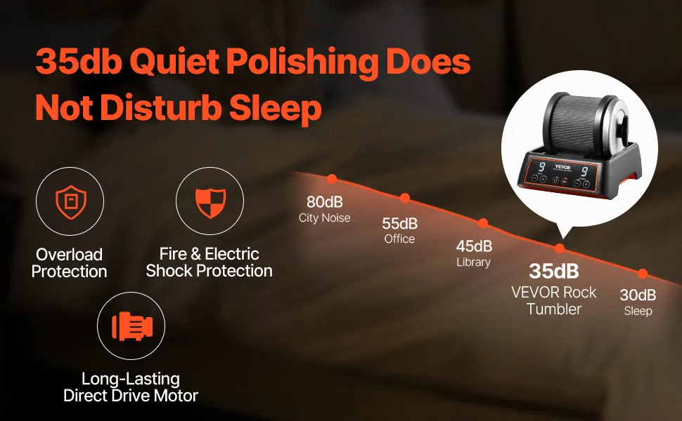 Motor de transmisión directa sin correa: ¡Olvídate de las correas rotas! El motor de transmisión directa ofrece una potencia eficiente con un funcionamiento silencioso de 35 dB. El kit de pulidora de rocas se mantiene frío incluso después de un uso prolongado, lo que garantiza una mayor vida útil para disfrutar de la diversión sin fin.