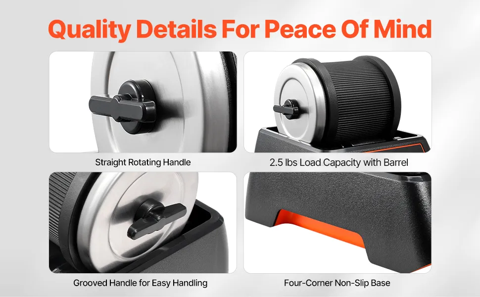 Diseño de seguridad inteligente: El tambor de piedra cuenta con una tapa curva mejorada para un giro fácil y seguro. La cámara de alto sellado evita fugas de agua y mantiene limpio el espacio de trabajo. También cuenta con un asa acanalada para levantarlo fácilmente y almohadillas antideslizantes para mantener la máquina estable durante su uso intensivo.