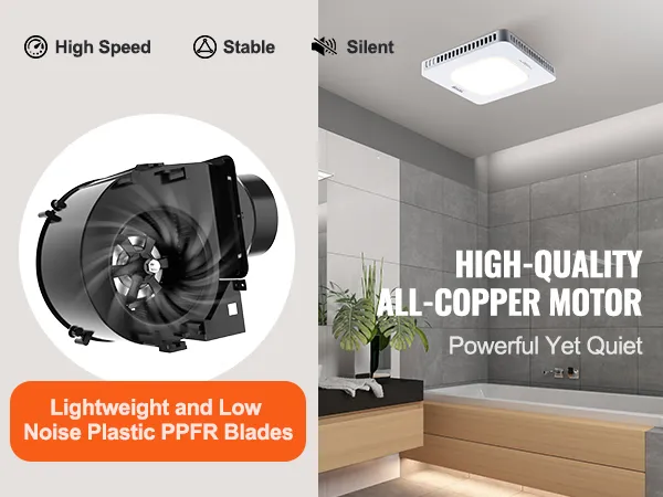 Nuestro extractor de aire para baño ofrece un potente flujo de aire de 80 CFM con un motor de alta calidad y un funcionamiento silencioso, gracias a un impulsor de plástico PPFR liviano.