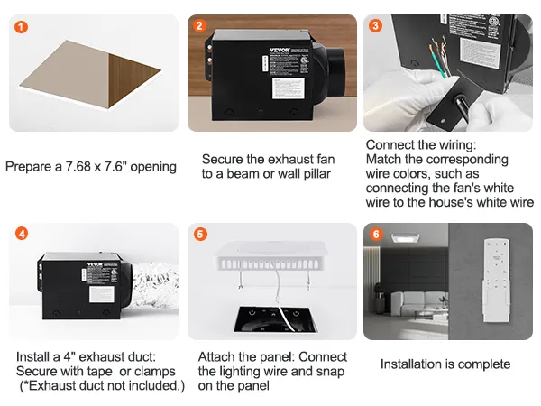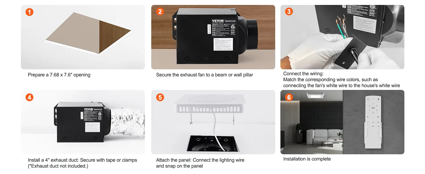 Fácil instalación: este extractor de aire presenta un diseño sin cortes y ventilación montada en el techo, lo que simplifica la instalación. No se requiere acceso al ático y las dimensiones del corte del techo son 7,68 x 7,6 pulgadas (195 x 193 mm). Puede instalarlo directamente o reemplazar un ventilador existente, siguiendo las instrucciones proporcionadas para una configuración rápida.