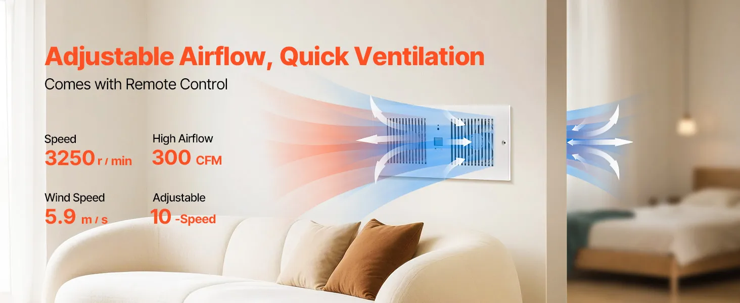 Dual Airflow Adjustment: This in wall fan offers 10-speed settings and temperature control ranging from 14℉ to 212℉, allowing you to adjust based on different climates. With dual airflow adjust, you can control the ventilation direction