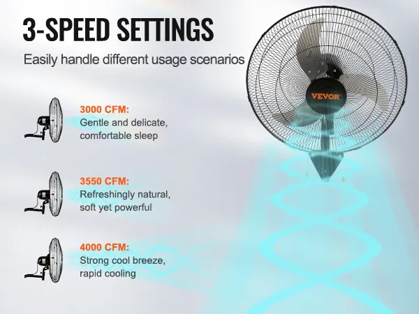 Our set of 2 wall-mounted fans ensures powerful cooling airflow even in the most expansive areas. With 3 adjustable speed settings and a 30ft air delivery range, cool comfort reaches every corner effortlessly.