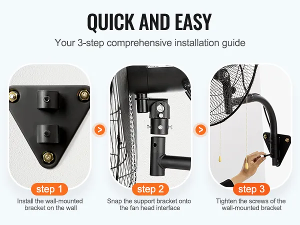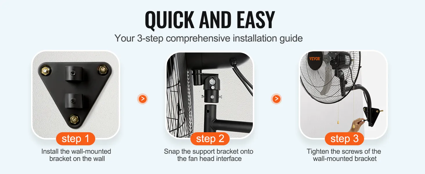 Say goodbye to the hassle of complicated installations with our wall-mounted fan's straightforward three-step setup process, making it effortless to enjoy refreshing airflow wherever you need it.
