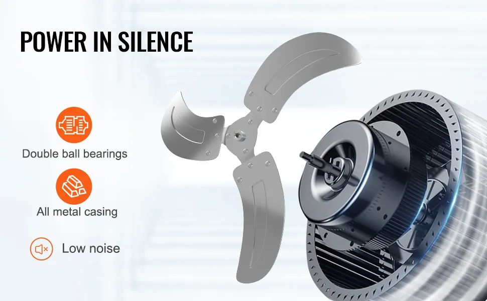 Equipado con rodamientos de bolas dobles y una carcasa completamente metálica, este ventilador de pared garantiza un funcionamiento eficiente manteniendo bajos niveles de ruido. No solo garantiza una fuerte salida de flujo de aire, sino que también proporciona una experiencia de ventilación cómoda en condiciones silenciosas.