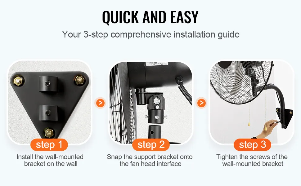 Dígale adiós a las molestias de las instalaciones complicadas con el sencillo proceso de configuración de tres pasos de nuestro ventilador de pared, lo que le permitirá disfrutar sin esfuerzo de un flujo de aire refrescante dondequiera que lo necesite.