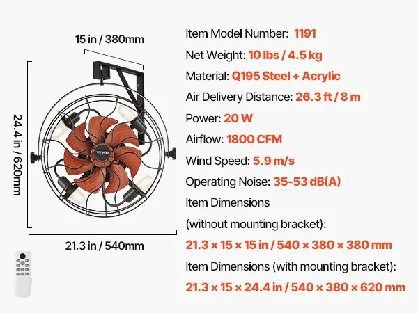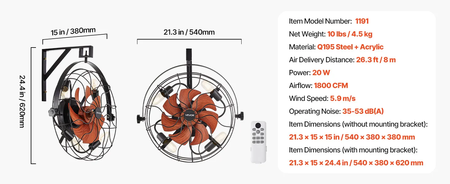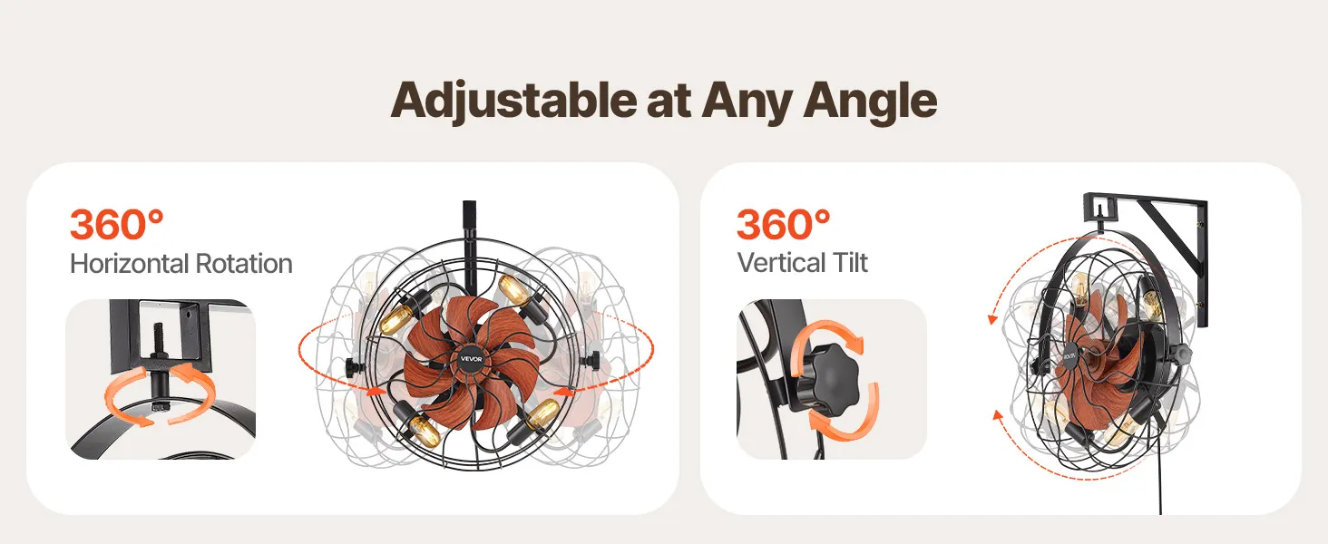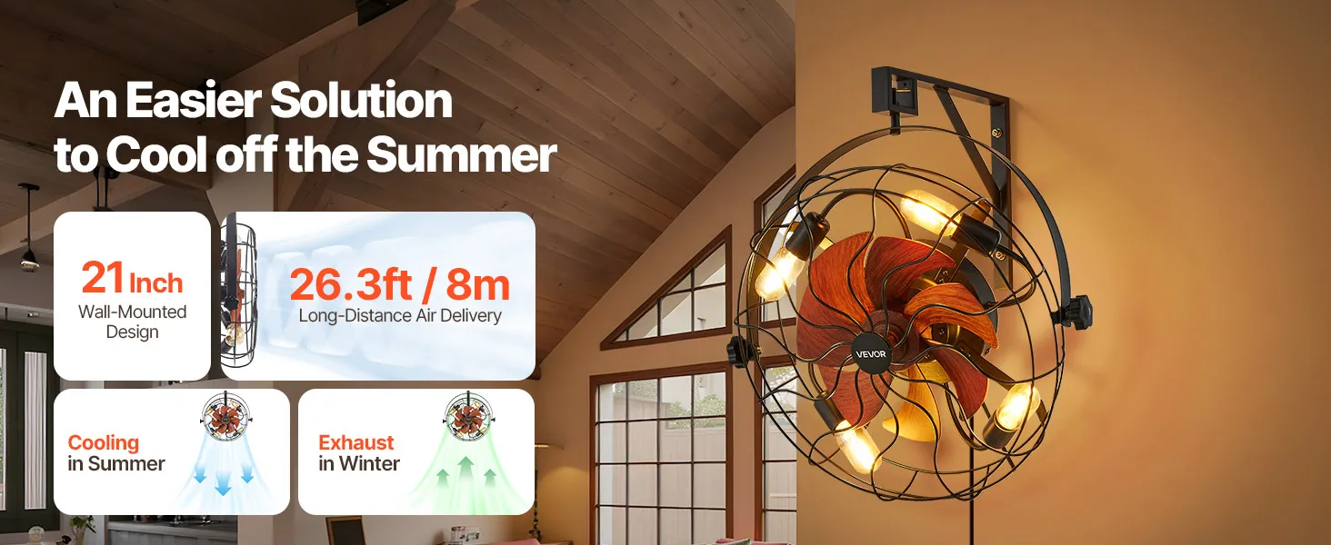 Ventilador de pared VEVOR con luces, 21 pulgadas, con control remoto, 6 velocidades, temporizador, inclinación ajustable de 360° para dormitorio, garaje y taller (compatible con 4 casquillos E26, sin bombilla).