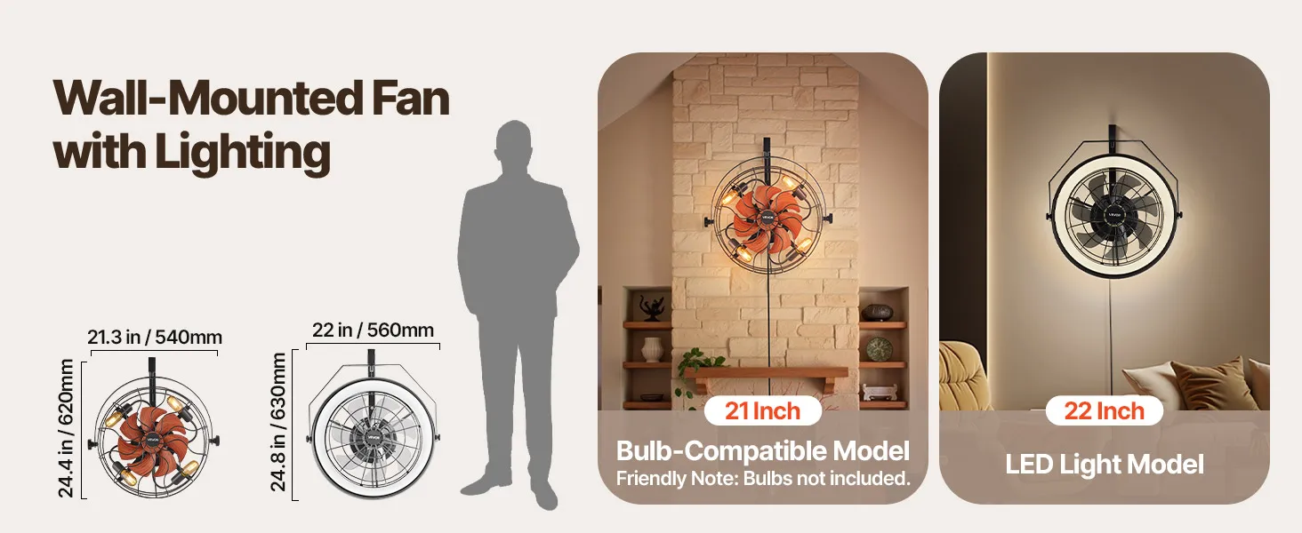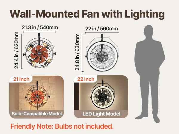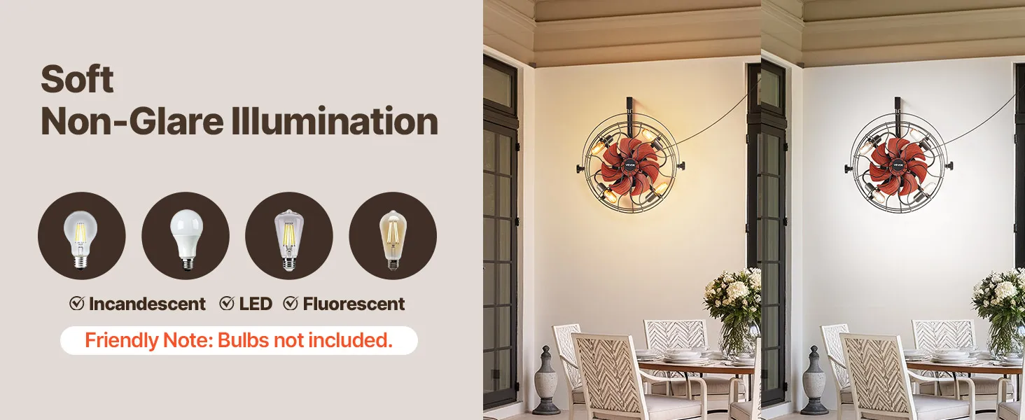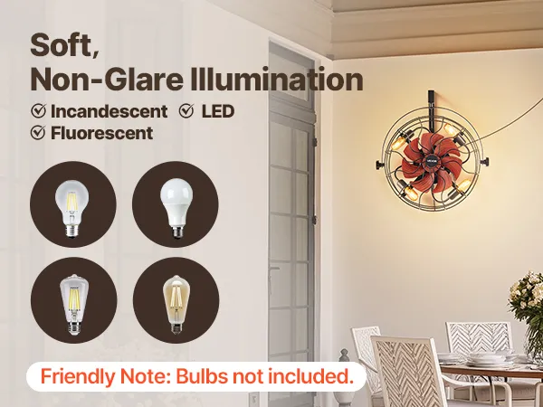Compatible con bombillas E26: Este ventilador de pared es compatible con bombillas con casquillo E26 estándar, como incandescentes, LED o CFL. Las bombillas no están incluidas y deben adquirirse por separado para su instalación.