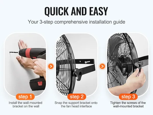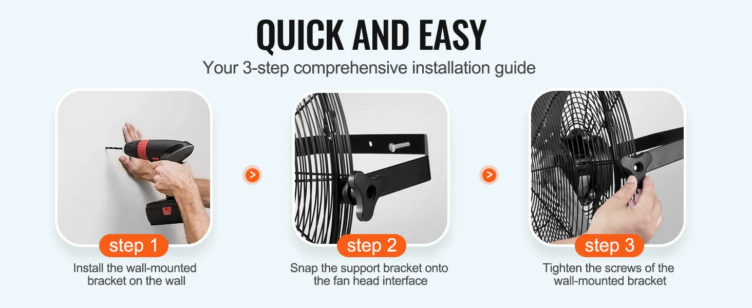 Say goodbye to the hassle of complicated installations with our wall-mounted fan's straightforward three-step setup process, making it effortless to enjoy refreshing airflow wherever you need it.
