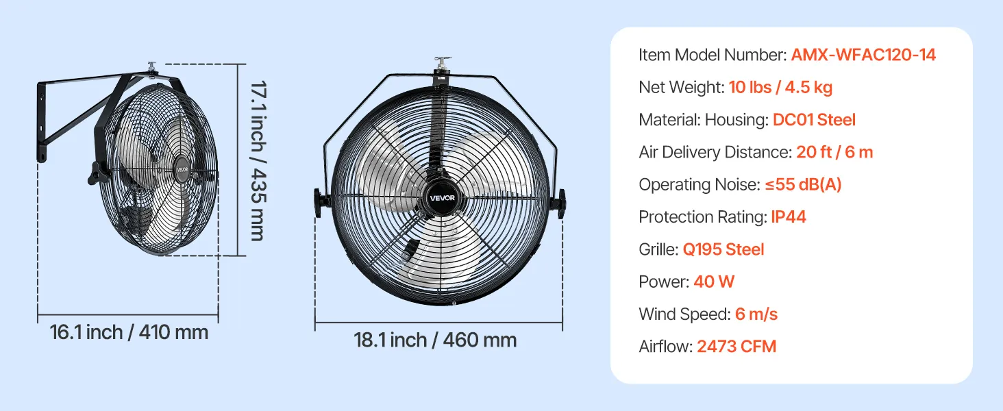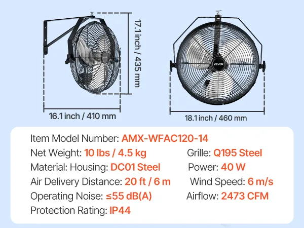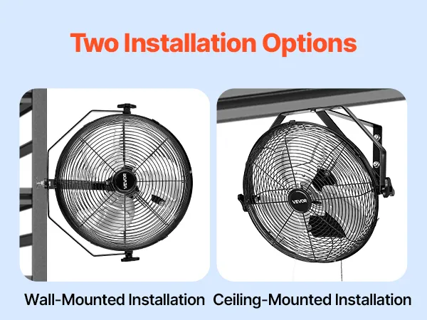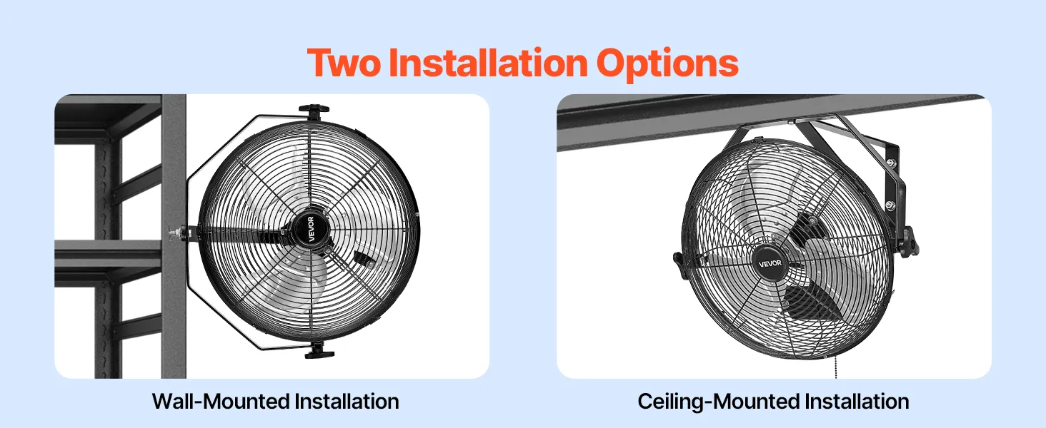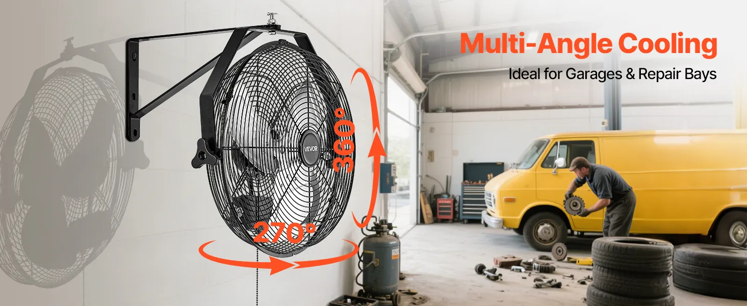360° Adjustable Air Direction: The industrial wall mount fan supports full horizontal and vertical 360° adjustment, allowing precise airflow targeting across large workspaces