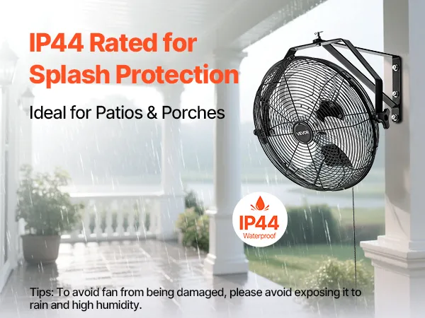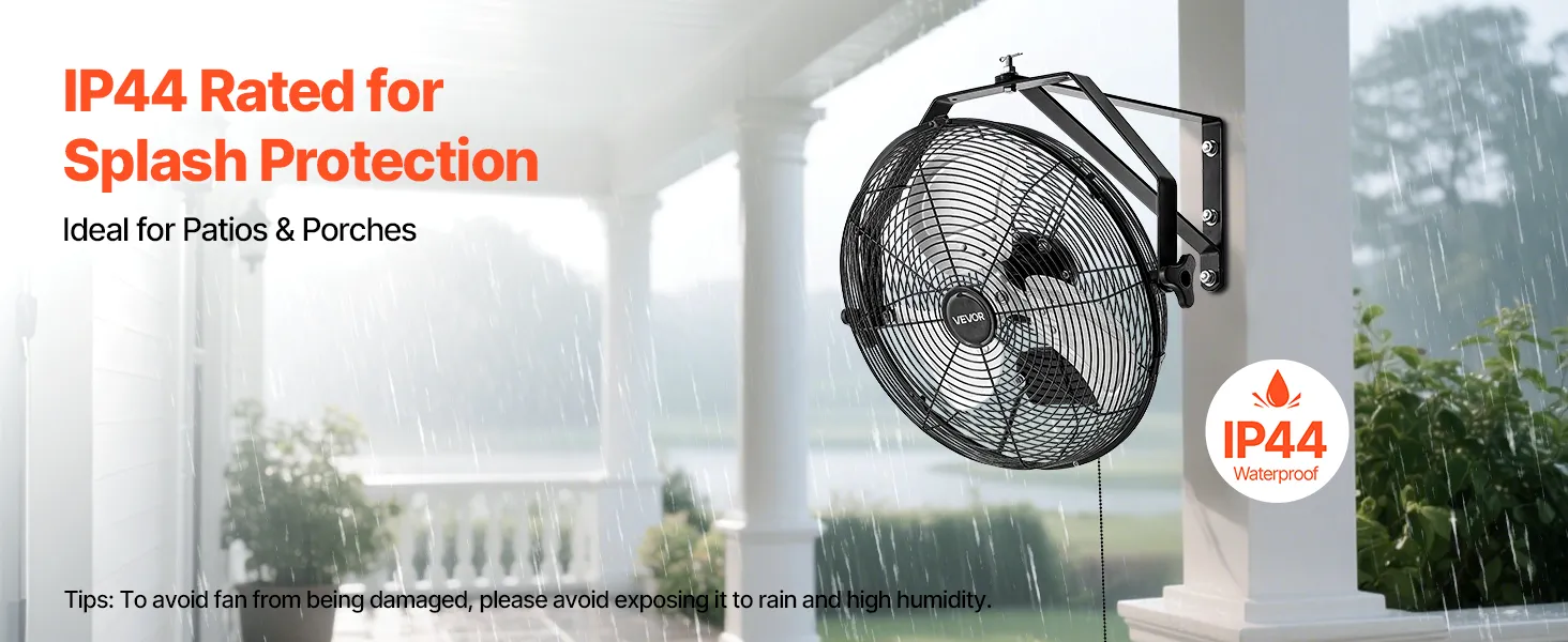 IP44 Waterproof: Secure in damp areas, The wall-mounted fan features a fully enclosed motor with IP44 protection, copper windings, dual ball bearings, and a GFCI plug for secure use in humid or semi-outdoor spaces