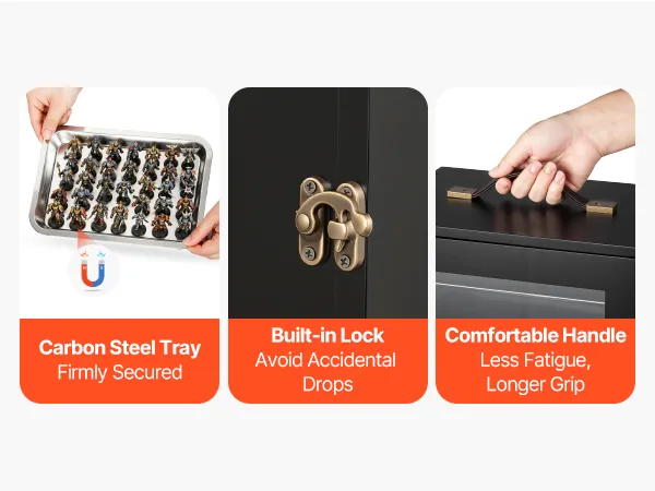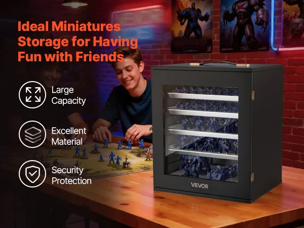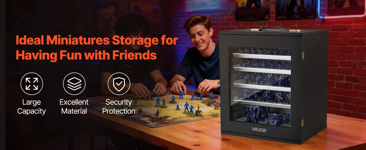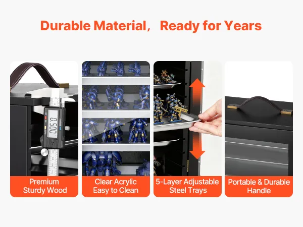 Este estuche de almacenamiento en miniatura está diseñado para coleccionistas que viajan. Su cuerpo de madera resistente a los golpes soporta impactos y aplastamientos, mientras que cinco bandejas magnéticas ajustables de acero al carbono mantienen las miniaturas seguras, organizadas y con amplio espacio, ideal para viajes, convenciones o almacenamiento diario.