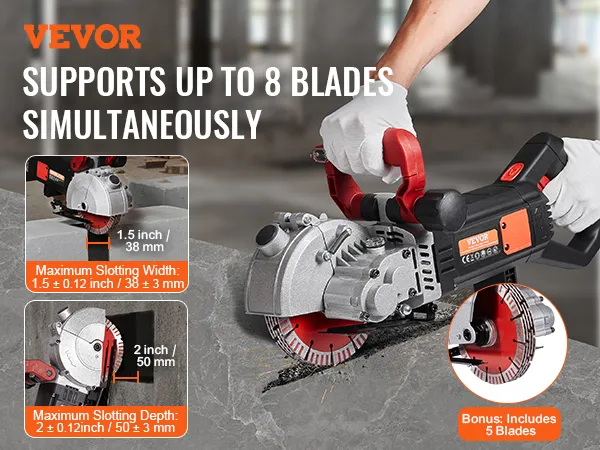 Rozadora de muros VEVOR, 2500 W, ancho de corte de 38 mm/1,5", profundidad de corte de 52 mm/2", ranuradora de muros con 5 hojas de sierra de 6,3" de diámetro, 6300 r/min, conformado único sin polvo