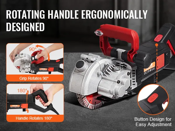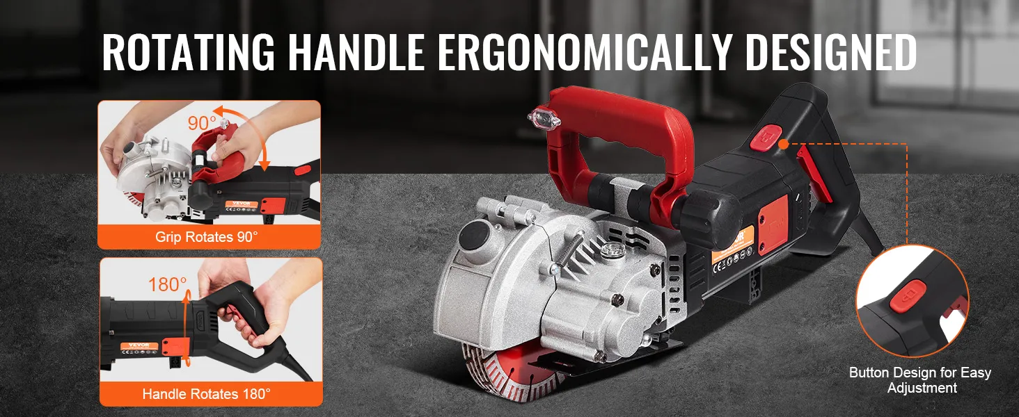 Mango ergonómico: esta ranuradora de pared tiene un mango giratorio con un agarre cómodo que se puede girar 180 grados hacia la izquierda y hacia la derecha, lo que significa que puede realizar cortes en múltiples ángulos según las demandas del lugar de trabajo, desde concreto hasta mármol, disfrutará de un corte de alto rendimiento con la ranuradora de pared eléctrica Vevor.